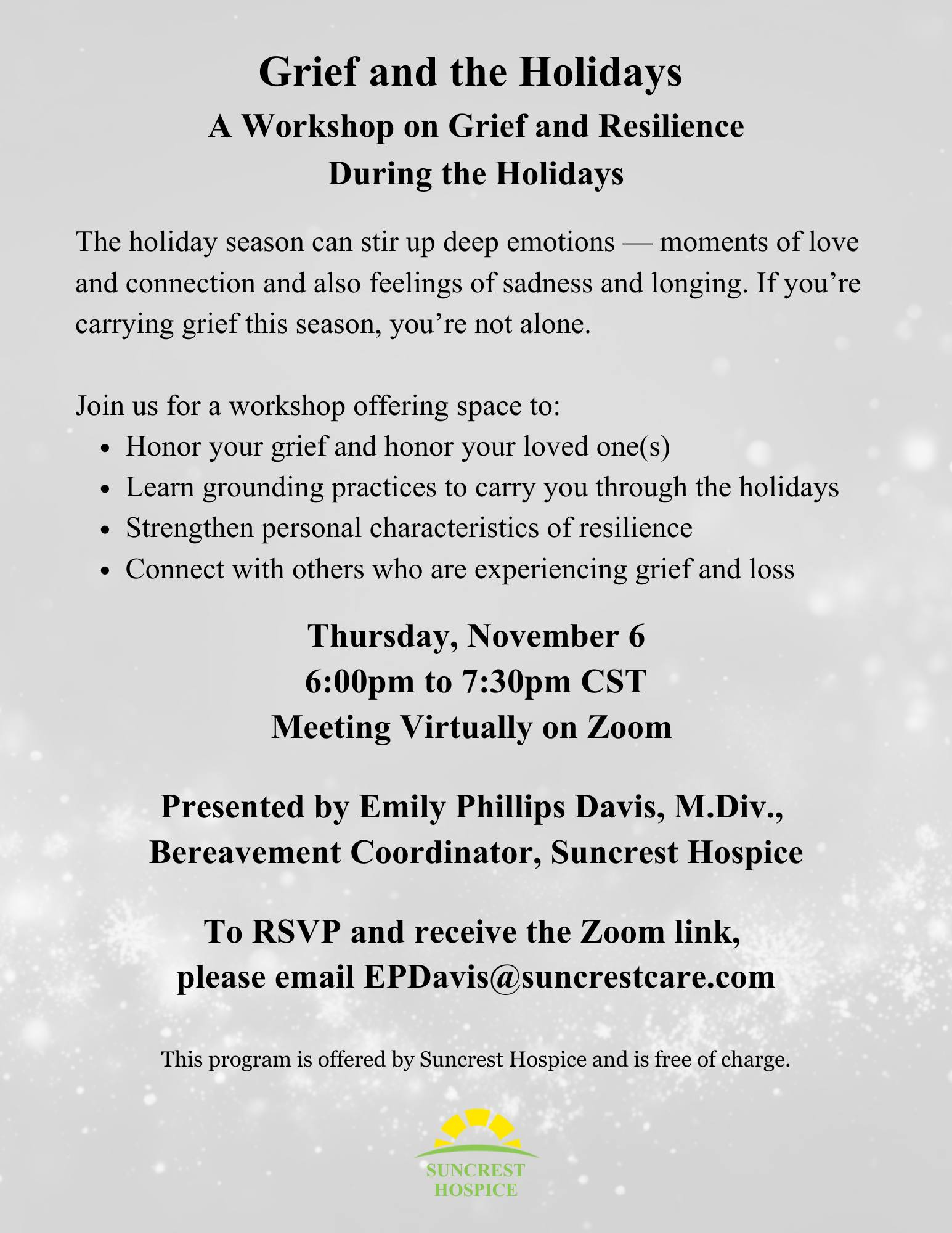 Join us for a virtual workshop offering space to honor your grief and honor your loved one(s), learn grounding practices to carry you through the holidays, strengthen personal characteristics of resilience, and connect with others who are experiencing grief and loss.